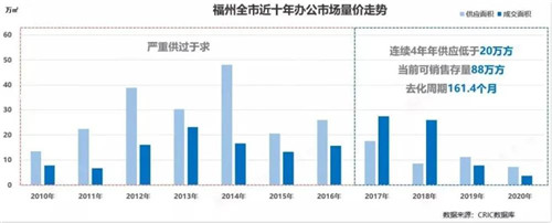 從福州近十年的辦公市場來看,整體其實已經(jīng)呈現(xiàn)嚴重供過于求的態(tài)勢,且連續(xù)4年年供應(yīng)低于20萬方。而當前的可銷售存量已達到了88萬方,去化周期高達161.4個月。