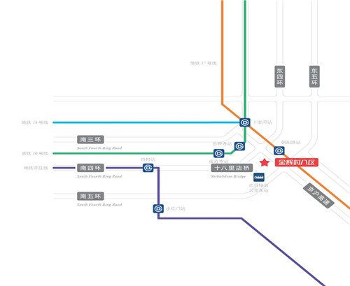 金輝時八區項目地處北京東南四環核心位置,北望國貿, 南鄰亦莊,緊鄰東南四環及京滬高速.南四環路、京滬高速公路、大羊坊路,三條城市主干路途徑項目,通達全城.地鐵10號線和亦莊線位于項目西側,未來規劃城市輕軌17號線位于項目東側,北起昌平區未來科技城北站,南至亦莊站前區南站,項目建成后,地鐵5號線、10號線、17號線貫穿聯通整個地塊