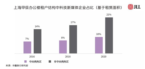 產業集群是衡量辦公樓商務板塊規模的重要指標,包含了產業規模、企業活躍度、人才聚集等要素。研究表明,在上海的辦公樓租戶構成中,金融服務業已成為基石行業,在中央商務區租戶中占比超過四成,在非中央商務區占比達30%,且逐漸呈上升之勢;而科技新媒體行業同樣推動辦公樓需求持續增長,帶動辦公樓板塊的產業聚集。