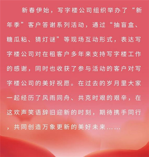 [提要]北辰寫字樓公司組織舉辦了“新年季”客戶答謝系列活動,通過“抽盲盒、糖瓜粘、猜燈謎”等現場互動形式,表達寫字樓公司對在租客戶多年來支持寫字樓工作的感謝。