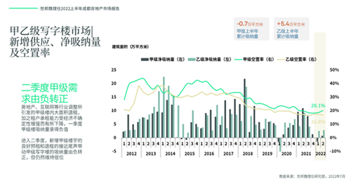 7月14日,世邦魏理仕發(fā)布上半年成都房地產(chǎn)市場(chǎng)報(bào)告,2022年上半年,成都寫字樓市場(chǎng)凈吸納量?jī)H約4.7萬(wàn)平方米,較2021下半年顯著下降64.6%;零售物業(yè)凈吸納量為-3271平方米。