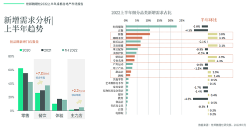而在零售物業(yè)方面,由于疫情的反復(fù)阻礙跨城市旅游,品牌的擴(kuò)張需求放緩,尤其是服飾及大型正餐品牌,成都零售物業(yè)市場(chǎng)凈吸納量為負(fù)值,整體空置率較去年底上升0.9個(gè)百分點(diǎn)到8%。其中,教育、正餐和服飾需求半年環(huán)比下降最大,分別下降了4.8%、4.5%和2%。