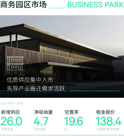 2024年一季度,上海商務(wù)園區(qū)寫字樓市場(chǎng)迎來(lái)四個(gè)新增供應(yīng),分別為位于張江的居里路一號(hào)項(xiàng)目,位于市北的靜安國(guó)際·云匯數(shù)智中心,位于金橋的金鼎·星馳中心和云璟生態(tài)社區(qū)商墅,共計(jì)26.0萬(wàn)平方米,同環(huán)比上升顯著。季度凈吸納量4.7萬(wàn)平方米,同比下降9%,環(huán)比下降51%。推動(dòng)當(dāng)前整體空置率至19.6%,同比上行2.7個(gè)百分點(diǎn),環(huán)比上行1.3個(gè)百分點(diǎn)。