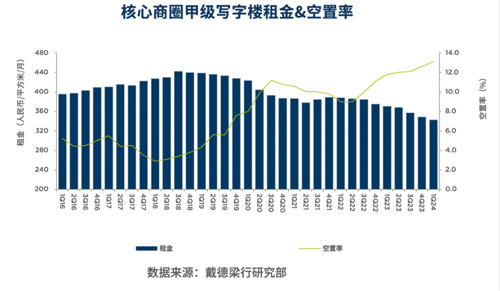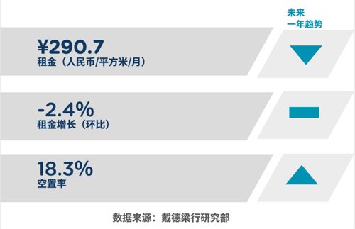 一季度,受新興商圈大面積成交租賃的影響,北京整體市場季度凈吸納量已接近2023年全年水平,為14.4萬平方米。寫字樓市場成交的小幅回升令全市空置率自2022年二季度以來首次下調,環比下降0.4個百分點至18.3%。雖然一季度市場活躍度較2023年有所提升,但現有的高空置率持續給業主施壓,至此,北京全市租金繼續下探至每月每平方米人民幣290.7元。