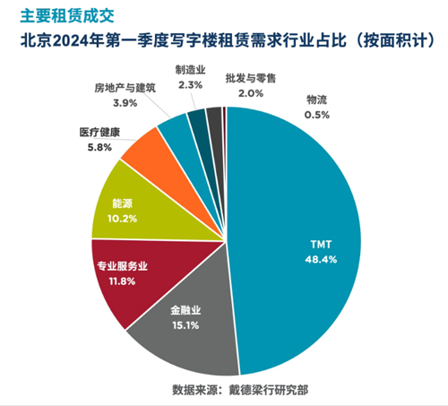 一季度,隨著北京數字經濟的快速發展,TMT行業成交面積約占所有行業總成交面積的一半,為48.4%。其次為金融業和專業服務業,分別占所有行業總成交面積的15.1%和11.8%。能源行業則延續2023年的強勁勢頭,位居第四位,占所有行業總成交面積的10.2%。