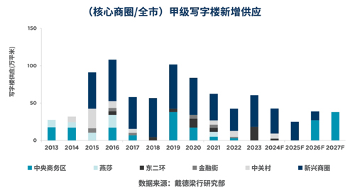 截止至2027年,北京寫字樓市場新增供應將達144.7萬平方米,其中2024年為供應高峰。預計二季度,新項目的入市加之市場的高空置很難在短期內被去化,租金水平將繼續面臨下行壓力。下半年隨著經濟和市場活躍度的逐漸恢復,預計年底租金水平將趨于穩定或迎來觸底拐點。未來幾年,隨著企業經濟效益的好轉、新興產業的快速布局和相關政策的不斷推進,北京寫字樓市場租賃需求有望得到提升。