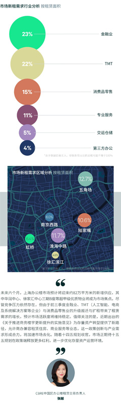 從行業需求來看,金融業連續三個季度領跑市場,占比達23%,主要受到保險和基金公司的需求推動;TMT上升至第二位,占比22%,增長動力源于人工智能以及數字解決方案類企業的旺盛需求;消費品零售業位列第三,占比15%,快消及時尚品牌的擴張成為其主要驅動力;專業服務業排名第四,占比11%,主要受益于法律和咨詢公司的搬遷擴張需求;值得關注的是,交運倉儲行業本季度躋身前五,占比達5%,這一變化釋放出物流、電商及進出口貿易持續向好的積極信號。