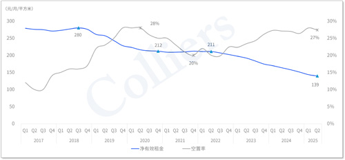 二季度深圳市甲級寫字樓凈有效租金環比下行2.6%至139.4元每月每平方米。雖然下行趨勢延續,但環比降幅收窄2.4個百分點。較大的租金調整主要出現在個別過往較少降租的項目中,不過集中于新興商務區的未來供應預計在年內仍將結構性拉低全市平均租金。