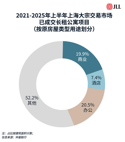 仲量聯行數據顯示,根據成交建筑面積計算,2021年至2025年上半年,上海大宗交易市場已成交長租公寓項目中,原有用途為辦公樓、商業和酒店的項目分別占比20.5%、19.9%和7.4%。上海“商改住”新政的推出,無疑將進一步推動老舊、低效的存量商辦資產轉化為當下更符合租住需求的功能業態。