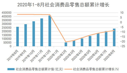 據國家統計局數據,1-8月社會消費品零售總額累計值錄得238029億元,累計增速為-8.6%,相比上月提升了0.5%。