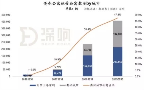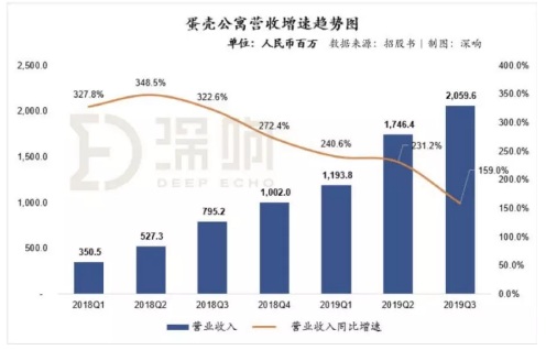 在此前深響對蛋殼招股書的拆解中,我們提到過,蛋殼公寓主要營收的租金和服務費目前持快速增長的狀態:2017年營收6.56億元,2018年營收26.75億元。最新數據顯示,2019年前10個月的總營收為57.13億元人民幣,較去年同期的19.92億元增長187%。