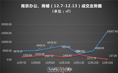 據南京網上房地產數據,南京樓市上周(12月7日-12月13日)商業地產銷售市場共成交面積59662.71㎡,環比上漲42.91%。其中辦公類產品成交48358.62㎡,環比上漲242.95%,商鋪類產品成交11304.09㎡,環比下跌59.11%。