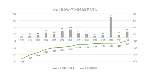 而辦公銷售市場同樣與租賃市場一樣呈現出萎靡趨勢,據克而瑞數據顯示,2019年重點城市寫字樓成交面積及同比均出現下降,其中北上廣深跌幅均在10%以上,重點城市中,寧波同比跌幅高達62%。