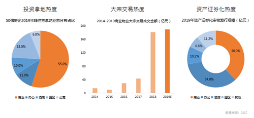 與此同時,2019年的商業仍受追捧,投資熱度不減。克而瑞數據顯示,50強房企在2019年非住宅拿地業態分布中,商業以55%的高占比遙居非住宅業態之首。投資拿地的熱度上漲,與近年來商業成交額度的快速上漲不無關系,數據顯示,在2018年商業物業大宗交易成交金額以超3倍增速達到181.15億元之后,2019年成交金額再創新高達到189.4億元。值得關注的是,在2019年資產證券化審核發行規模中,商業的占比也居于首位,達到38%。