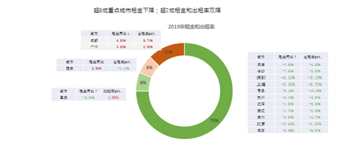 丁祖昱在現場表示,克而瑞數據監測顯示,2019年辦公租賃市場呈現頹勢,超八成重點城市租金下降,超七成重點城市租金和出租率雙降,重點城市中僅有廣州、成都、西安租金同比上升,而北上深租金、出租率均出現了雙降的情況。