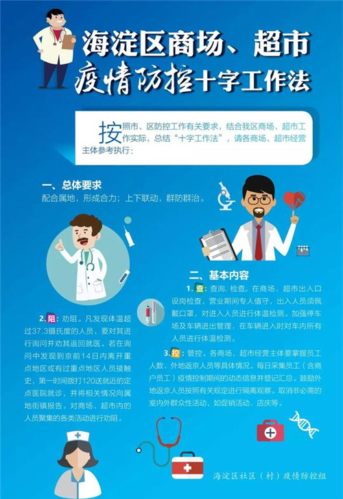 按照市、區防控工作有關要求,結合海淀區商場、超市工作實際,總結“十字工作法”,請各商場、超市經營主體參考執行: