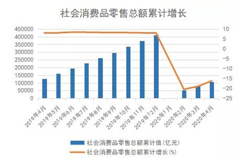 據國家統計局數據顯示,4月社會消費品零售總額當期值為28178億元,同比下降7.5%;而1-4月的累計值為106758億元,累計增長為-16.2%。與1-3月的累計值78579.7億元,累計增長-19%相比,下降幅度明顯減小。