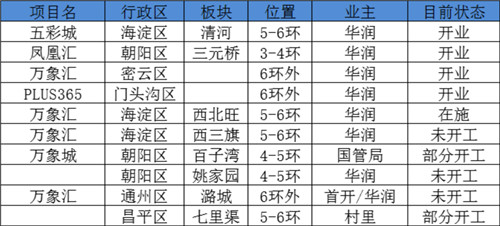 據不完全統計,截至目前華潤置地在北京地區正處于運營階段的項目主要包括:密云萬象匯項目、海淀清河五彩城項目、三元橋鳳凰匯項目、門頭溝華潤Plus365項目。