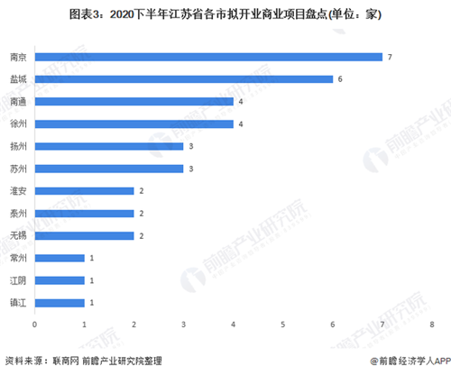 具體看2020年下半年江蘇省各個(gè)城市新開購物中心情況,江蘇省計(jì)劃下半年新增購物中心36家,商業(yè)項(xiàng)目體量將新增405.36萬方,主要分布在南京市與鹽城市,這兩座城市擬開業(yè)商業(yè)項(xiàng)目數(shù)量占江蘇省一半比重。