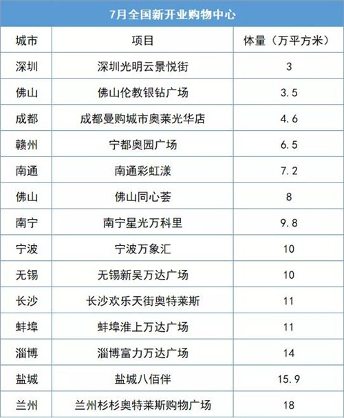 新開業購物中心方面,據觀點指數不完全統計,7月新開業項目共有14個,總體量為125.9萬平方米,基本與上月持平。