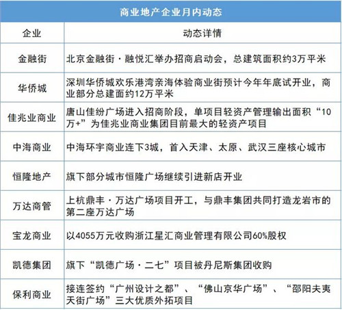 國內商業地產企業本月的動作較多,不少近年來崛起的商業地產后來者更是多有表現,其中以中海商業、保利商業等最為活躍。