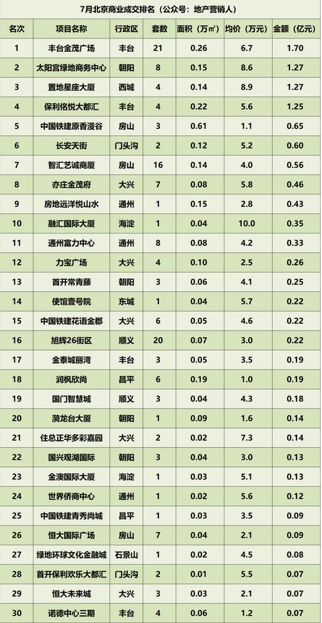 7月,北京商業市場新增供應59套,環比上漲84%;成交172套,環比下降39%;成交面積3.21萬㎡,環比下降17%;成交均價38311元/㎡,環比上漲15%;成交金額12.3億元,環比下降5%;目前存量18679套。其中,豐臺金茂廣場以1.7億元的月度成交額位居成交榜首。