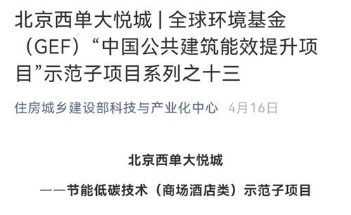 2020年,北京西單大悅城商場節能改造項目確定為全球環境基金(GEF)“中國公共建筑能效提升項目”示范子項目,通過實施中央空調系統全面節能措施,實現年二氧化碳減排2985噸,同時促進高效制冷機房成套技術、組合式空調機組風機變頻控制措施、夜間通風措施和BIM運維等關鍵技術的研究與推廣。