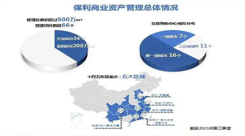 成都大都匯保利廣場和龍口嘉元保利廣場齊開,驗證了保利商業輕重并舉的拓展模式。目前,保利商業在全國運營管理優質購物中心項目66個,管理面積超過500萬㎡。其中,已開業項目34個,開業面積超過200萬m2。十四五重點布局五大區域,注重區域化深耕。