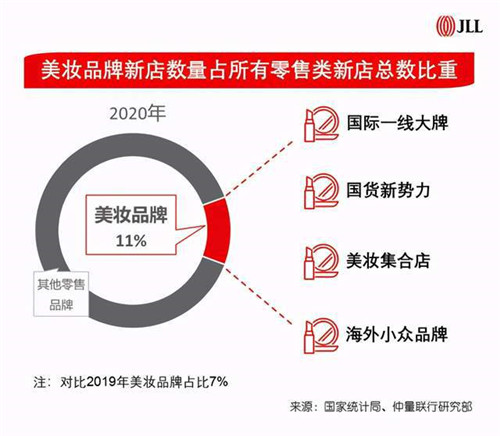 在仲量聯行追蹤觀察的100家上海優質購物中心中,2020年美妝品牌新店數量占所有零售類新店總數比重約11%,較19年同比提升4個百分點。這背后的原因不言自明:對于年輕消費者來說,化妝品消費等同于剛需消費,是日常生活中必不可少的投入。