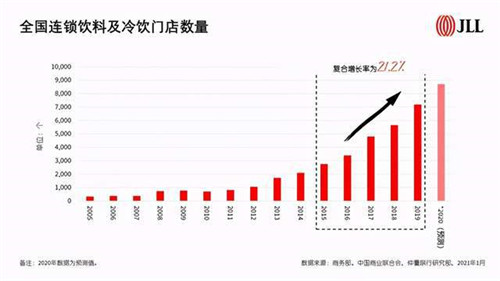 幾年前,由于店鋪數量有限,在很多城市,喝喜茶、奈雪の茶都需要找黃牛去排隊。而如今,Sevenbus、茶顏悅色等品牌已經悄然崛起,不但頭部品牌快速下沉,占領各級市場,在商業模式簡單可復制、進入門檻低等因素的推動下,越來越多單品價格在10至20元的品牌加入了市場競爭。據仲量聯行統計,自2015年起,全國連鎖飲料及冷飲門店數量的年復合增長率高達21.2%。尤其是在去年,高利潤率引發資本入局以及外賣市場因疫情而火爆更是給茶飲咖啡品牌的急速擴張再添把火,市場競爭因此加劇。