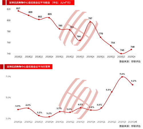 2020年第四季度,深圳主要商圈優質購物中心最優租金層平均租金為748元/㎡·月,環比略有回升;空置率為6.2%,環比下降0.8個百分點。受新冠大流行沖擊,2020年年初商鋪普遍出現經營困難,不少商鋪出現退租現象,平均租金連續三個季度下行。第四季度,深圳疫情陰霾逐漸消散,零售市場渡過至暗時期,各大購物中心客流和銷售額有所恢復,平均租金略有反彈。