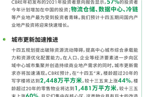 日前,國家“十四五”規劃綱要全文發布,再次強調了經濟提質增效、創新驅動發展、城鎮化和消費升級、可持續等重點議題。CBRE世邦魏理仕近日發表《中國“十四五”規劃解讀:2021-2025年國家發展目標及其對房地產市場的影響》,梳理未來五年中國主要經濟發展指標和目標,并提出覆蓋寫字樓、零售物業、產業地產、物業投資等板塊發展的關鍵詞。