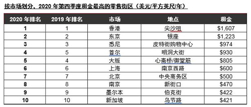 戴德梁行最近發布的《2021亞太區主要商業街區報告》顯示,香港尖沙咀地區在2020年成為亞洲最昂貴的零售街區。九龍購物中心取代了原來占主導地位的銅鑼灣。銅鑼灣的平均租金同比下降35%,經歷了香港歷史上最大跌幅,達43%。