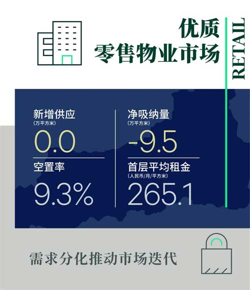 由于部分核心區域百貨項目出現大面積退租,疊加品牌擴張需求疲軟,全市凈吸納量錄得負值。相應地,市場整體空置率環比上升0.5個百分點至9.3%;購物中心首層平均租金延續下行趨勢,環比下跌0.8%。