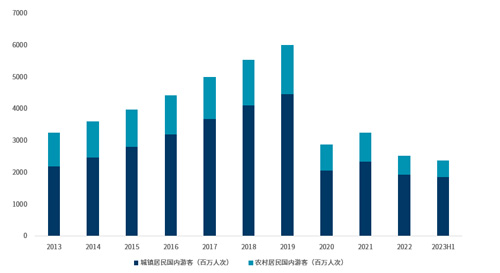 參考國家統計局及中國旅游研究院公布的最新數據,截至今年上半年,國內旅游總人次已達23.84億,同比增加9.29億,較上年同期增長近64%。其中,城鎮居民約18.59億人次,農村居民約5.25億人次,同比分別增長70%和44%(圖1)。