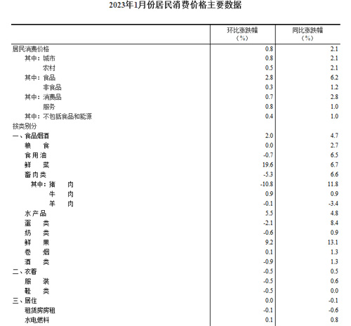 2023年1月份,全國(guó)居民消費(fèi)價(jià)格同比上漲2.1%。其中,城市上漲2.1%,農(nóng)村上漲2.1%;食品價(jià)格上漲6.2%,非食品價(jià)格上漲1.2%;消費(fèi)品價(jià)格上漲2.8%,服務(wù)價(jià)格上漲1.0%。