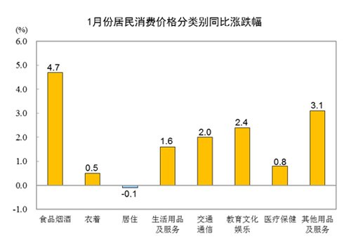 1月份,食品煙酒類價(jià)格同比上漲4.7%,影響CPI(居民消費(fèi)價(jià)格指數(shù))上漲約1.33個(gè)百分點(diǎn)。食品中,鮮果價(jià)格上漲13.1%,影響CPI上漲約0.27個(gè)百分點(diǎn);蛋類價(jià)格上漲8.4%,影響CPI上漲約0.06個(gè)百分點(diǎn);鮮菜價(jià)格上漲6.7%,影響CPI上漲約0.16個(gè)百分點(diǎn);畜肉類價(jià)格上漲6.6%,影響CPI上漲約0.21個(gè)百分點(diǎn),其中豬肉價(jià)格上漲11.8%,影響CPI上漲約0.16個(gè)百分點(diǎn);水產(chǎn)品價(jià)格上漲4.8%,影響CPI上漲約0.09個(gè)百分點(diǎn);糧食價(jià)格上漲2.7%,影響CPI上漲約0.05個(gè)百分點(diǎn)。