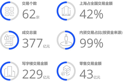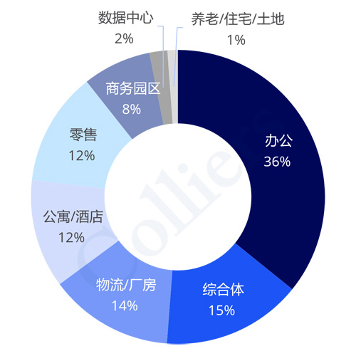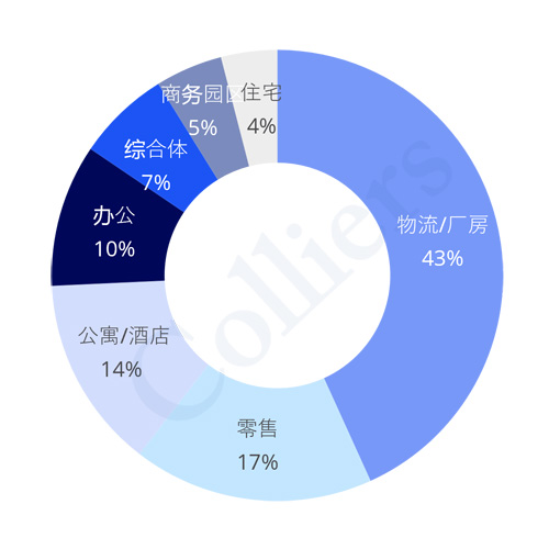 其次分別為物流/廠房、公寓/酒店、零售和商務(wù)園區(qū)等業(yè)態(tài),成交金額分別為124億元、113億元、108億元和68億元。