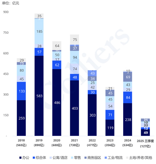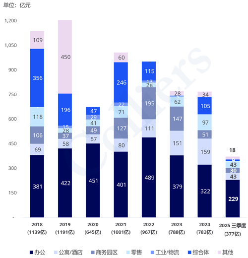 2018-2025年第三季度上海各物業(yè)類型大宗成交金額走勢