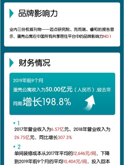 招股書披露,截至2019年11月30日,蛋殼公寓管理的公寓數量為432,690間。2019年前10個月的總營收為57.13億元人民幣,較2018年前10個月19.92億元增長187%。
