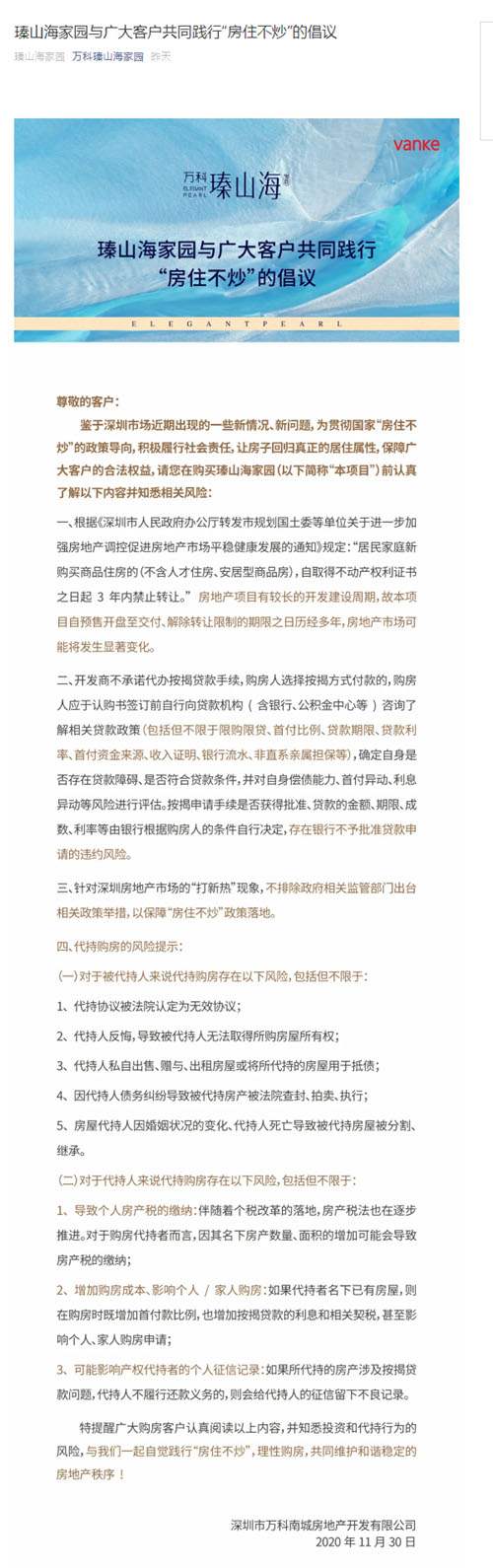 此外,深圳另一個“網紅盤”萬科瑧山海項目也發布了一封類似的“房住不炒”倡議。