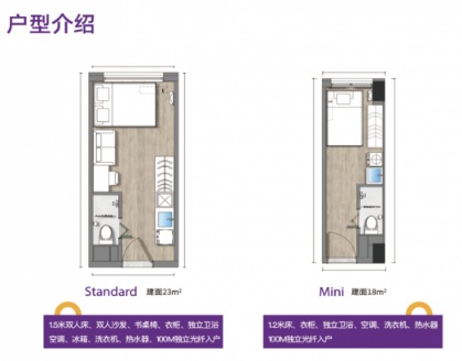 為了讓年輕人遠離合租帶來的種種苦惱,泊寓高立莊社區房間多為獨立開間。目前分為18㎡和23㎡(建筑面積)兩個戶型,屋內擁有獨立衛浴、專屬的冰箱和洗衣機,在房間里就可以做些簡單的料理,適合單身或小情侶居住。設計風格是年輕人喜歡的北歐風,簡單舒適又給租戶發揮的余地,打造自己喜愛的專屬空間。