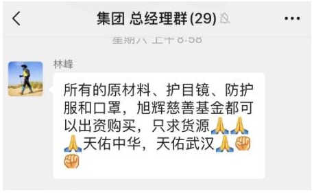 在朋友圈官宣這一消息后,旭輝控股總裁林峰開始在集團總經理群里發出動員:“所有的原材料、護目鏡、防護服和口罩,旭輝抗擊肺炎專項基金可以出資購買,只求貨源!