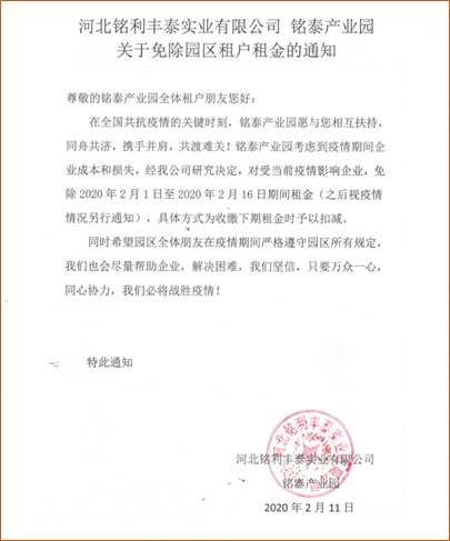 受新型冠狀病毒肺炎疫情影響,疫情仍在繼續,依舊牽動著每一個人的心。園區企業經營運作承壓,河北銘利豐泰實業有限公司·銘泰產業園感同身受。為鼓勵園區企業響應政府號召采取延遲開工的方式緩沖疫情影響,為減輕疫情對園區企業日常運營造成的影響,體現園區的責任擔當。銘泰產業園決定對園區入駐企業提供租金減免措施,疫情無情,園區有愛;以鼓勵和支持企業以延緩開工、網絡辦公、遠程會議等方式開展工作,共克時艱。