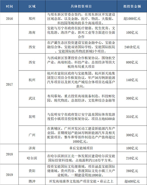 2017年以來,寶能先后簽下海南、西安、武漢、濟南、哈爾濱等多個百億級的投資大單,并憑借旗下新能源汽車業務相繼在杭州、昆明、廣州、西安西咸新區以及昆山與當地政府簽訂建立新能源汽車產業園的合作協議。據不完全統計,目前寶能在各地的投資計劃總金額已經超過4000億元。
