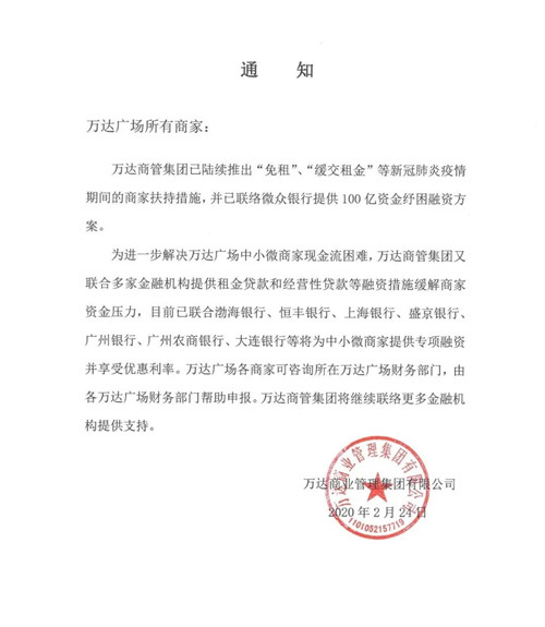 房訊網訊 2月24日,萬達商業管理集團發布通知,繼聯絡微眾銀行提供100億資金紓困融資方案后,萬達商管集團又聯合多家金融機構提供租金貸款和經營性貸款等融資措施緩解商家資金壓力,進一步解決萬達廣場中小微商家現金流困難。