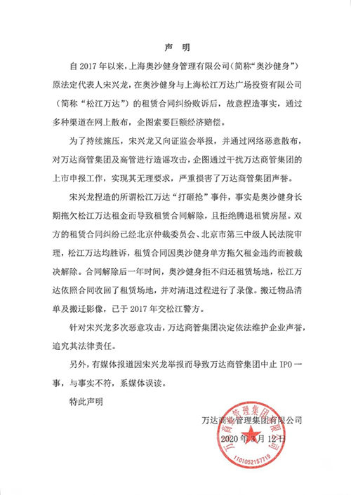 房訊網訊 3月12日,萬達商業管理集團有限公司發布聲明稱,自2017年以來,上海奧沙健身管理有限公司原法定代表人宋興龍,在奧沙健身與上海松江萬達廣場投資有限公司的租賃合同糾紛敗訴后,故意捏造事實,通過多種渠道在網上散布,企圖索要巨額經濟賠償。