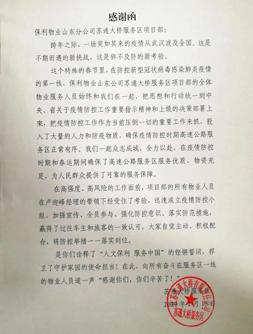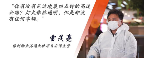 保利物業蘇通大橋項目作為物業參與社會基層防控治理的典型案例,其有效服務也得到了甲方的高度認可。物業行業,作為社會治理創新的重要一環,在疫情中承擔起防疫一線的職責,也得到社會的認可。