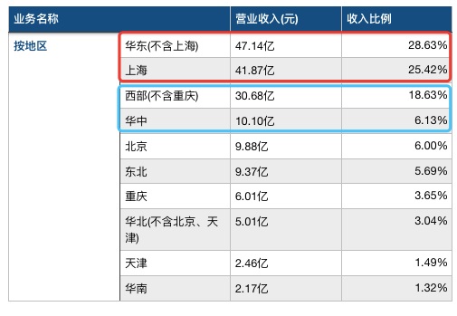 這一點(diǎn)在財(cái)報(bào)中也得到了體現(xiàn)。全部自營(yíng)的上海地區(qū)、多達(dá)105家委管的華東地區(qū)合計(jì)貢獻(xiàn)了超過(guò)50%的收入。另外,委管數(shù)量較多的西部和華中地區(qū)合計(jì)收入占比近25%。