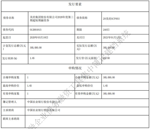 消息顯示,本期債券實際發行金額30億元,票面利率1.65%,發行期限240天,債券簡稱20美的SCP003,債券代碼012001815。